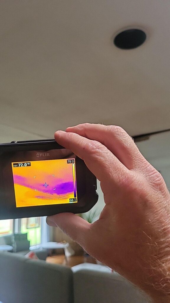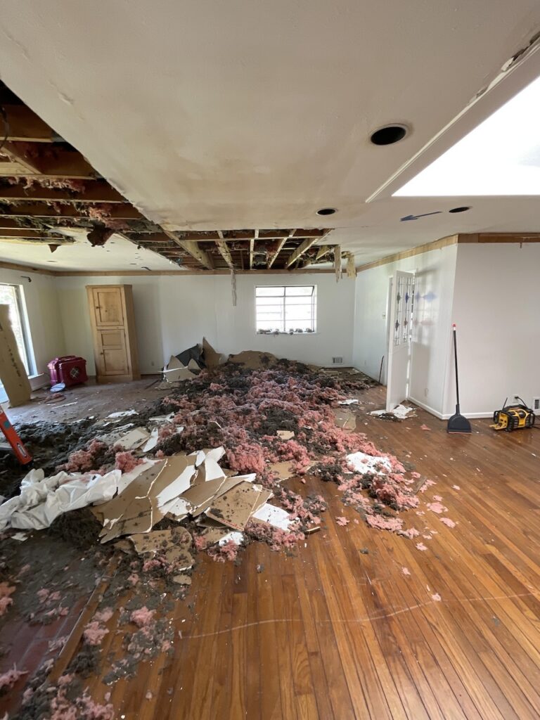 Unfortunately, the temporary fix didn’t hold up to the relentless weather. The homeowner noticed moisture spots growing on the ceiling, but by the time the extent of the problem was realized, the water had been soaking the drywall, insulation, and flooring for over a month.