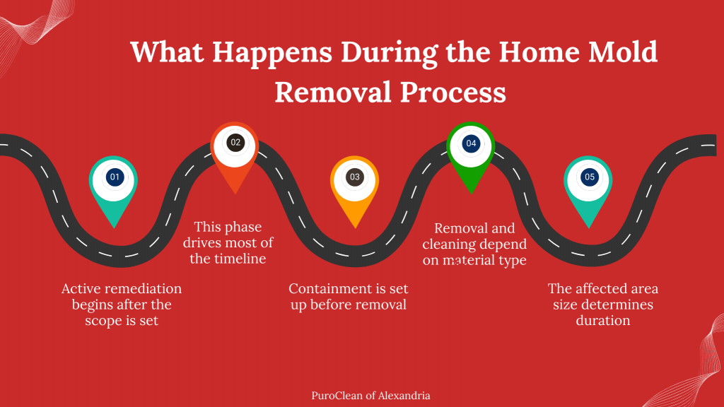 Once the scope is defined, active remediation begins. The home mold removal process focuses on isolating the affected space, removing contaminated materials, and cleaning remaining surfaces. This phase often determines the majority of the mold remediation timeline because it involves physical labor and detailed work. Depending on the extent of damage, this portion may last anywhere from two to seven days.