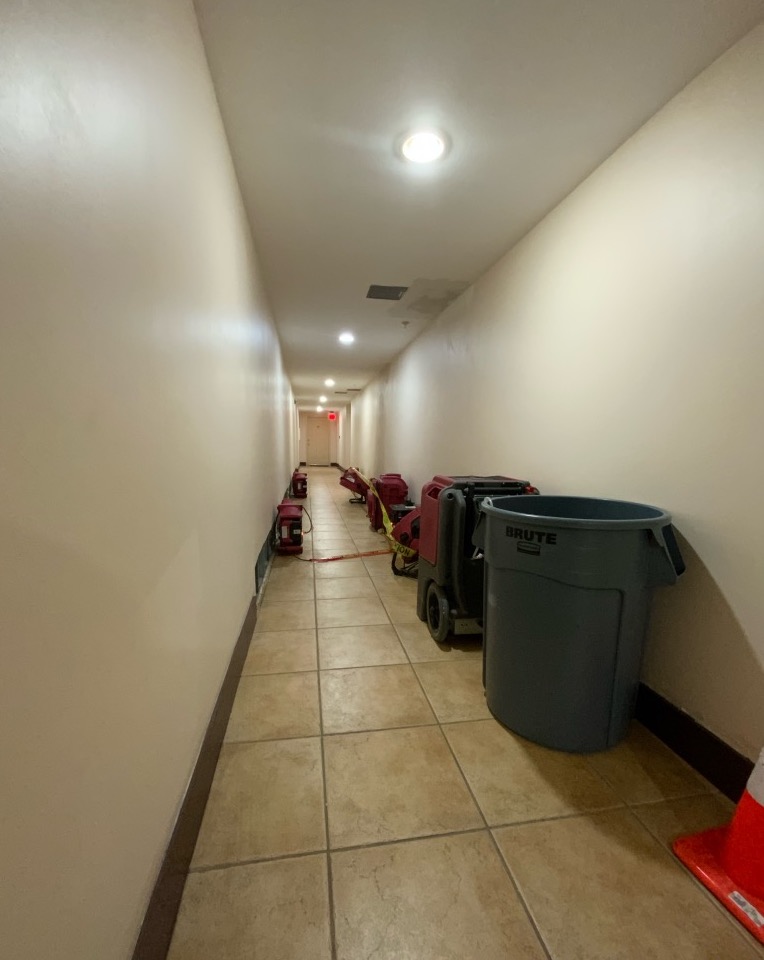 We also cut out the affected structural materials in the hallway, which helped prevent further deterioration and cleared the way for additional apartment building restoration. Our experienced technicians also removed the affected hallway carpets to prevent mold growth and restore cleanliness.