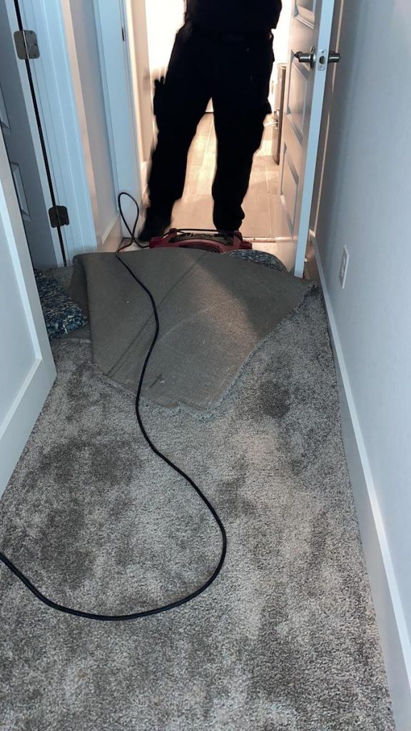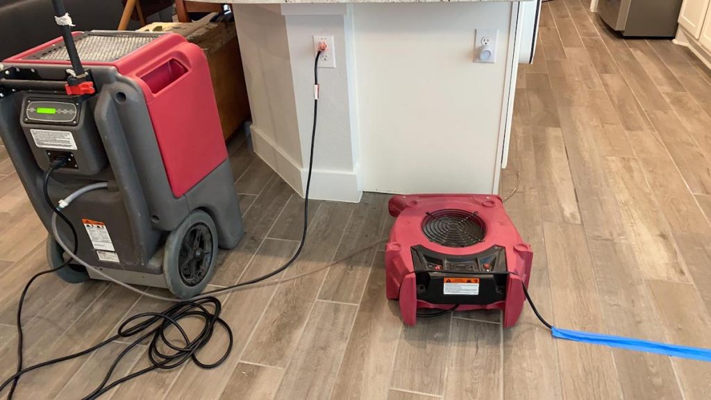 The homeowner had several area rugs that were saturated. We pulled them from the house, used the Rover (a rideable piece of drying equipment that slowly moves over and extracts moisture) to remove all the excess water, positioned them over some moving dollies, and used air movers to help dry them out. Next, we set up air movers in the entryway to the master bedroom to dry the saturated carpeting. We had to remove the trim from around the bottom of the kitchen island to be able to push air underneath to dry the water that traveled underneath.
