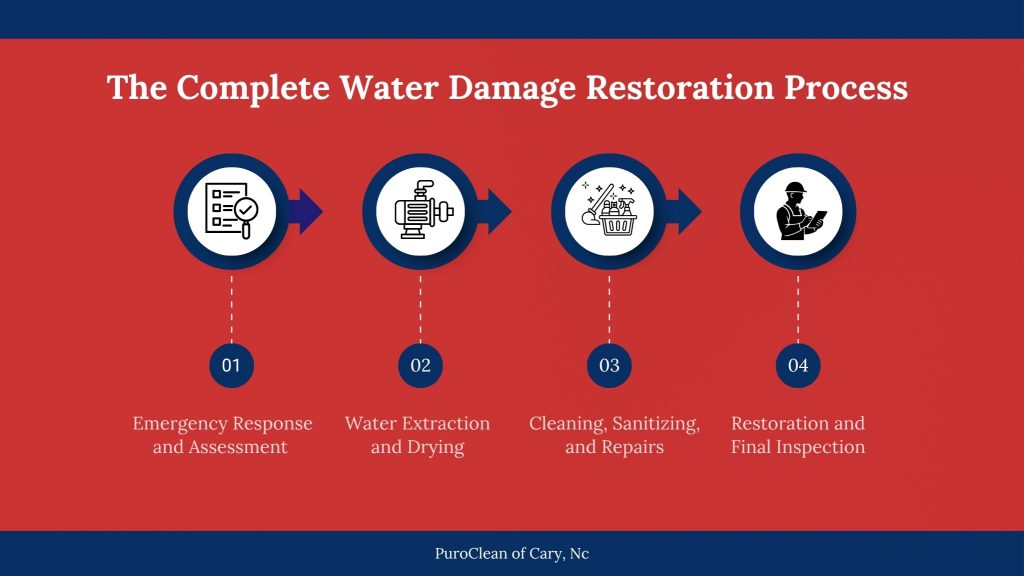 When a trusted local restoration team arrives, the first step is a complete assessment. They identify the water source, test the affected areas, and evaluate how far the damage has spread. Quick response is key, especially in humid environments like Apex, because moisture spreads fast and can lead to mold within 24–48 hours.