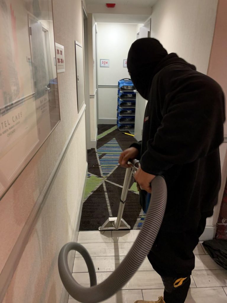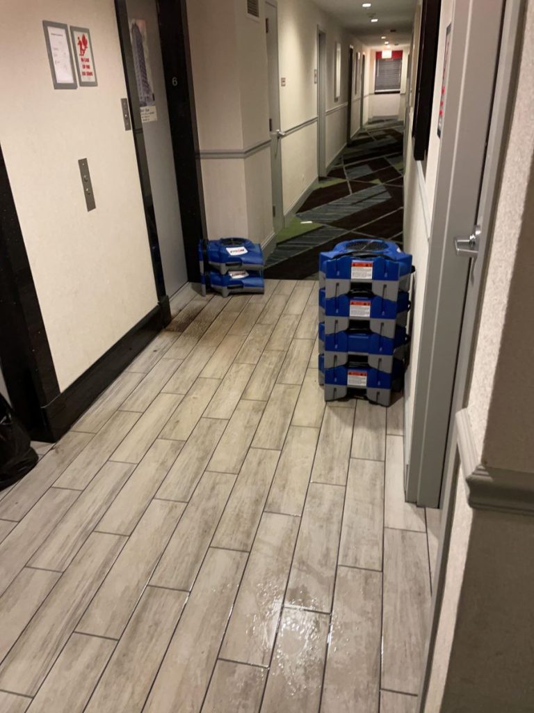 Project Manager Miguel Torres did a fantastic job leading the crew to complete the water mitigation. We brought in some of our other local crews for some extra help because of the elevator issue. Everyone did a wonderful job coming together as a team to get the job done for our client. The hotel was not happy with the commercial water damage they experienced, but they were more than satisfied with our quick response and superior workmanship.