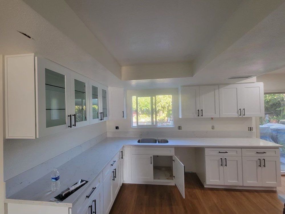 Our crew finished the hefty job in less than three months, including demolition, build-back of the kitchen, and replacing the home’s entire flooring.