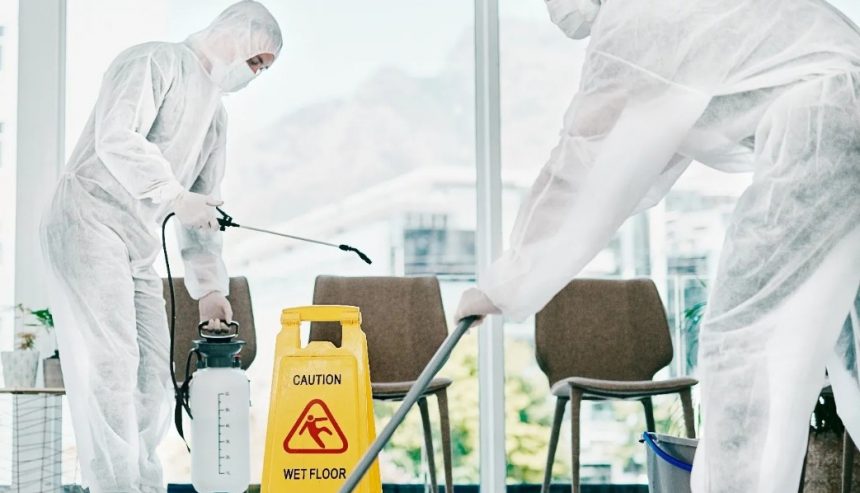 The area is thoroughly cleaned using hospital-grade disinfectants designed to eliminate bacteria, viruses, and other pathogens.