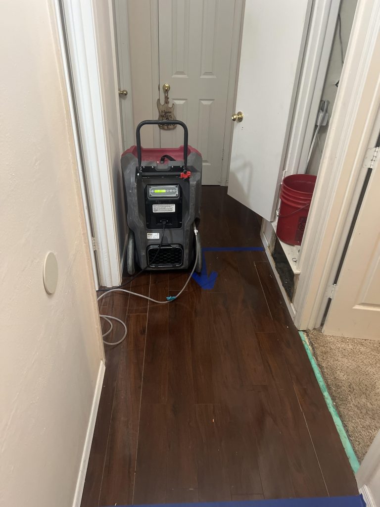 When our certified restoration technicians arrived at her home, we conducted a thorough inspection to assess the extent of the damage. Using a moisture meter, we discovered that the water from the HVAC condensate line leak had spread under the laminate flooring. When we removed the flooring, we could see clear signs of water damage— the underside of the laminate was wet, and there was noticeable swelling.
