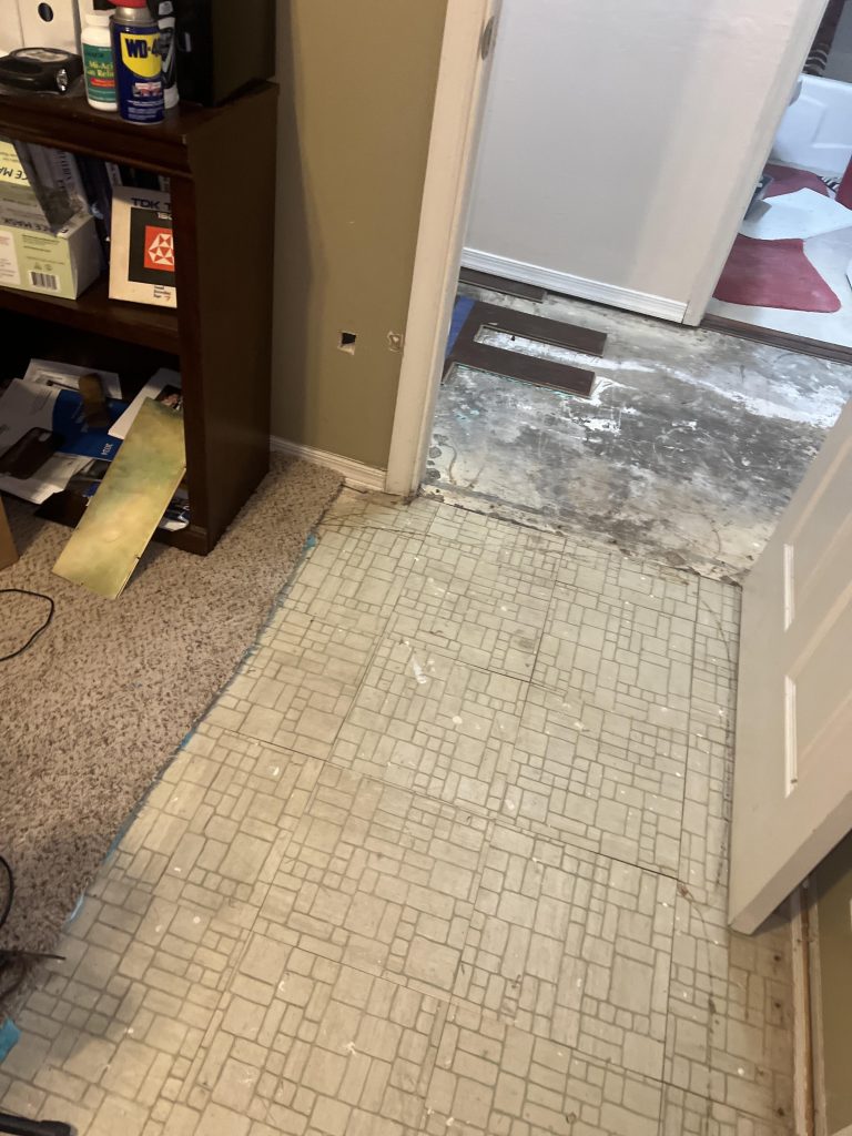 As we peeled back the carpet, we found yet another layer of flooring underneath—vinyl squares. This hidden layer surprised us and the homeowner, but as we often say, you never know what you’ll uncover during a restoration project. The old vinyl had not suffered as much damage, and we determined it could remain in place after we thoroughly dried the area.