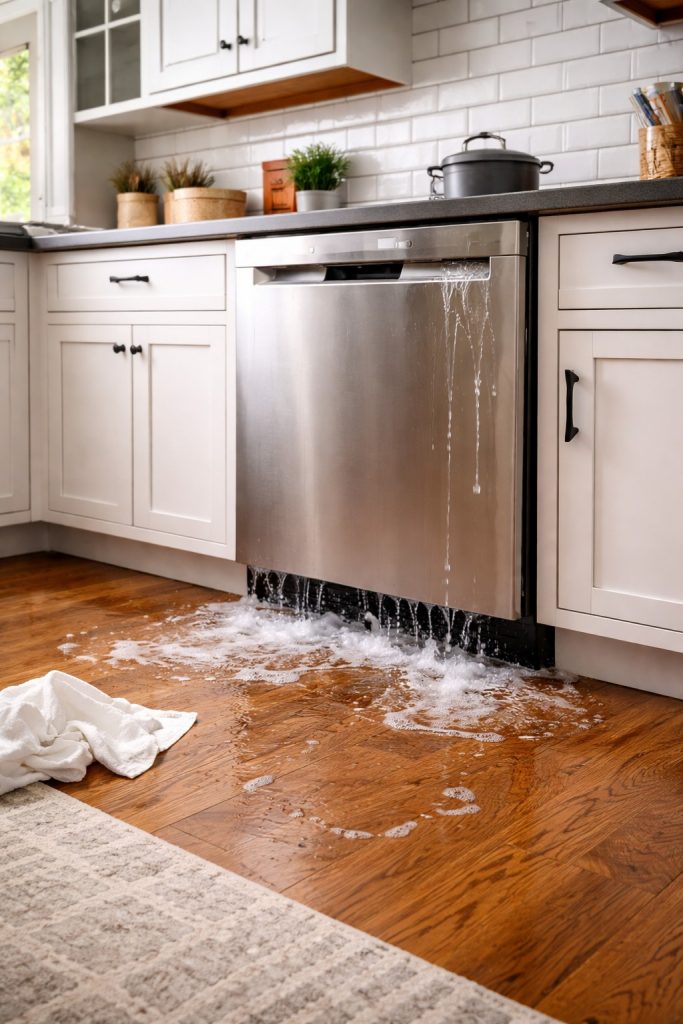 Dishwashers and garbage disposals can cause cabinet-level water damage that spreads under kitchen floors. Common issues include: