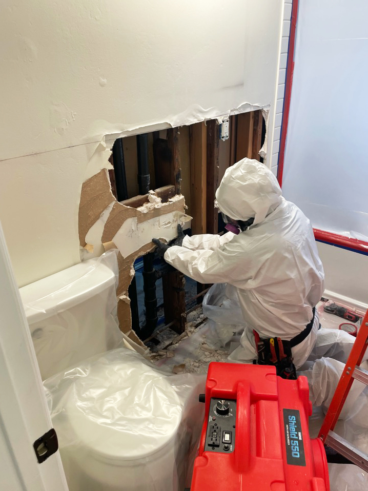 Upon receiving the call, Ryan and his team conducted a detailed inspection to assess the extent of the damage. The bathroom, bedroom, and hallway showed significant water damage and visible mold growth, necessitating urgent action. To contain the damage, we erected plastic barriers around these areas, effectively isolating them from the rest of the unit to prevent the spread of mold spores and further water damage.