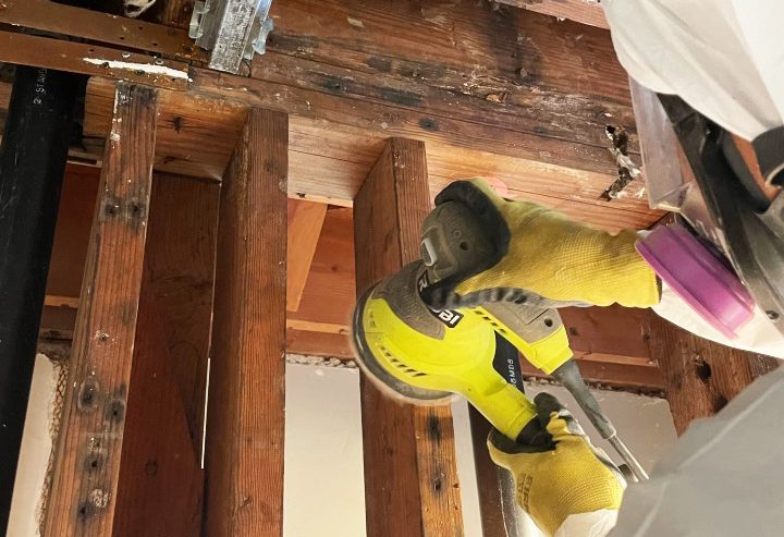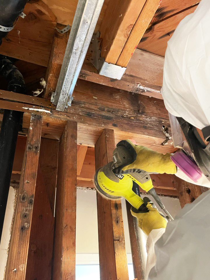 Post-demolition, our focus shifted to rigorous cleaning to address any residual mold. Every nail and screw was removed from the framing to facilitate thorough cleaning. We sanded and wire-brushed the wood framing to eradicate all traces of mold infestation. Following this, the entire area was HEPA vacuumed to capture any lingering dust and mold spores. An anti-microbial spray was then applied throughout the structure to combat future microbial growth, capped off with a comprehensive wipe down.