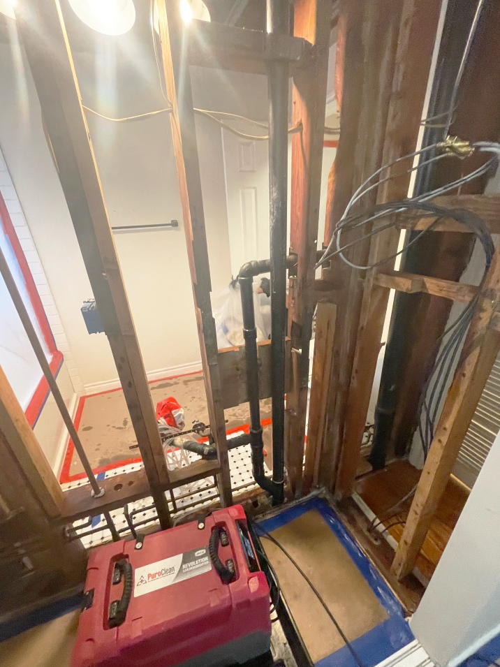 Understanding the critical nature of Category 3 water loss, which involves significantly contaminated water, we installed two dehumidifiers and a HEPA air scrubber in the affected areas. These units ran continuously for three days, with our team monitoring progress daily. During this phase, we also prepared for the demolition process by setting up ram board to protect the tile and hardwood floors from potential damage.
