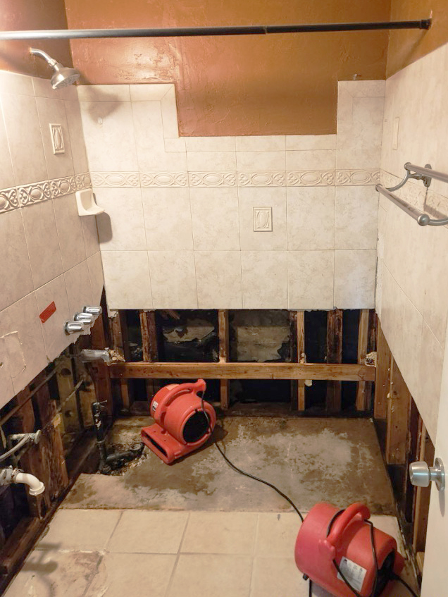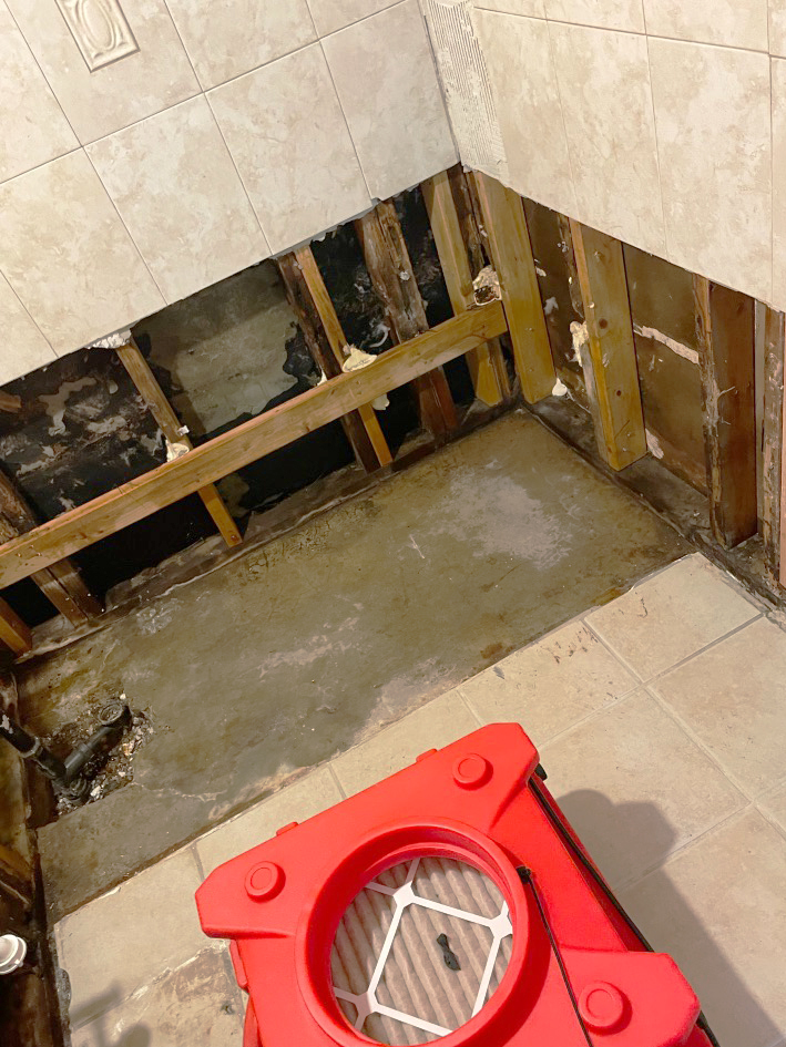 In the bathroom, the bathtub enclosure and wall tiles were dismantled, and a two-foot flood cut was made to remove affected drywall and insulation.