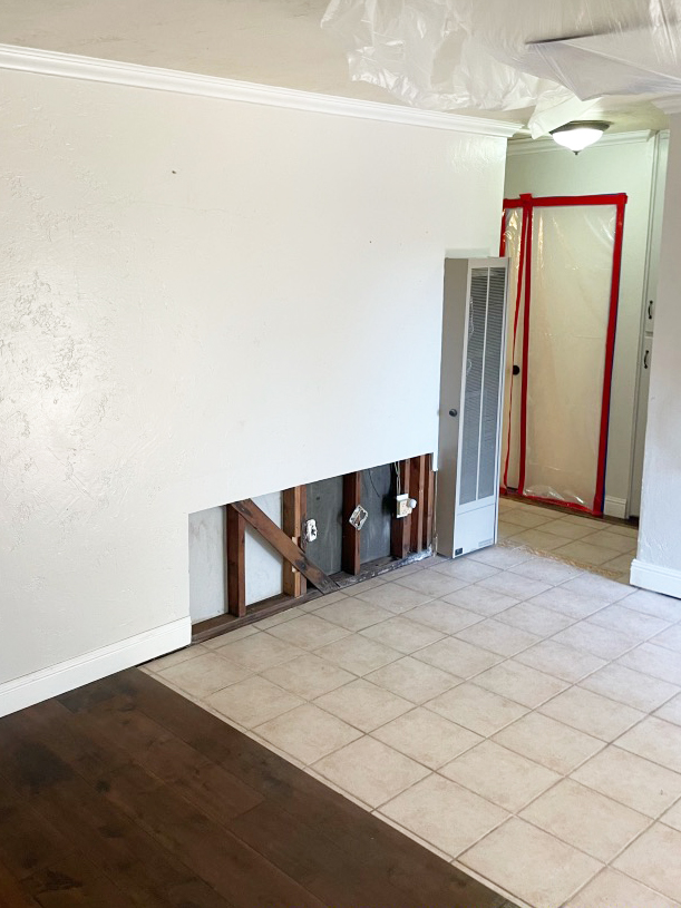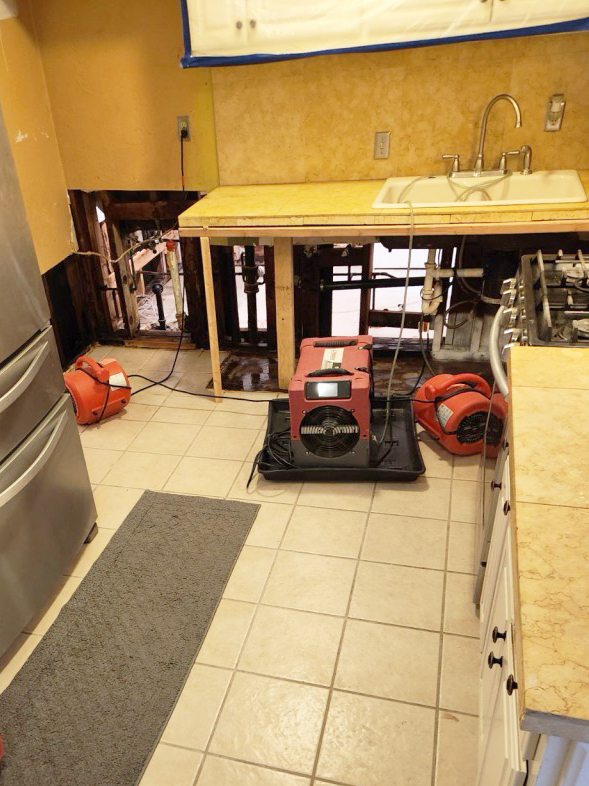 The kitchen, the origin of the leak, required careful dismantling of the cabinetry under the sink and shoring up the countertop with 2x4s to prevent further damage. A two-foot flood cut of the drywall was also executed here.
