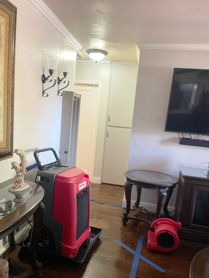 Upon arrival, the inspection revealed significant damage to the home’s drywall, insulation, baseboard, flooring, cabinetry, and tile. To address these issues, the team installed three dehumidifiers and eight air movers across the affected areas, setting up plastic barriers to isolate and concentrate the drying process effectively.
