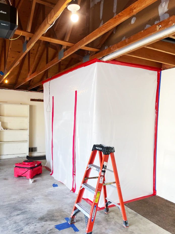 To control and contain the damage, plastic barriers were erected around the affected areas. This isolation was crucial for preventing moisture from spreading throughout the home, allowing for targeted drying efforts.