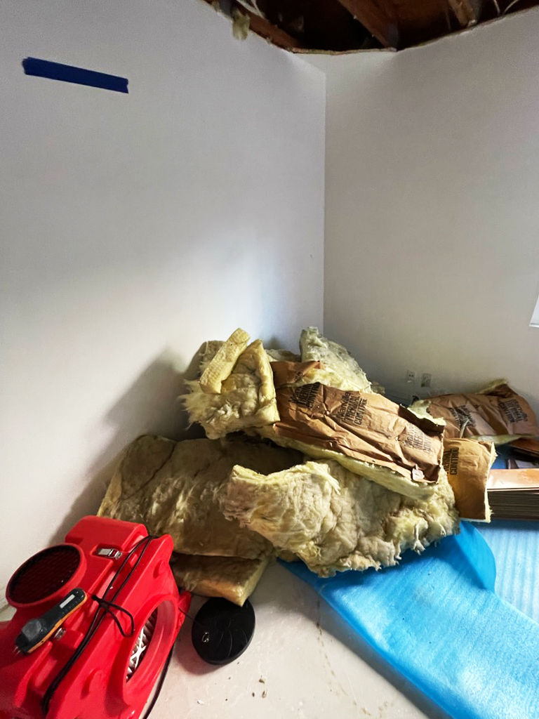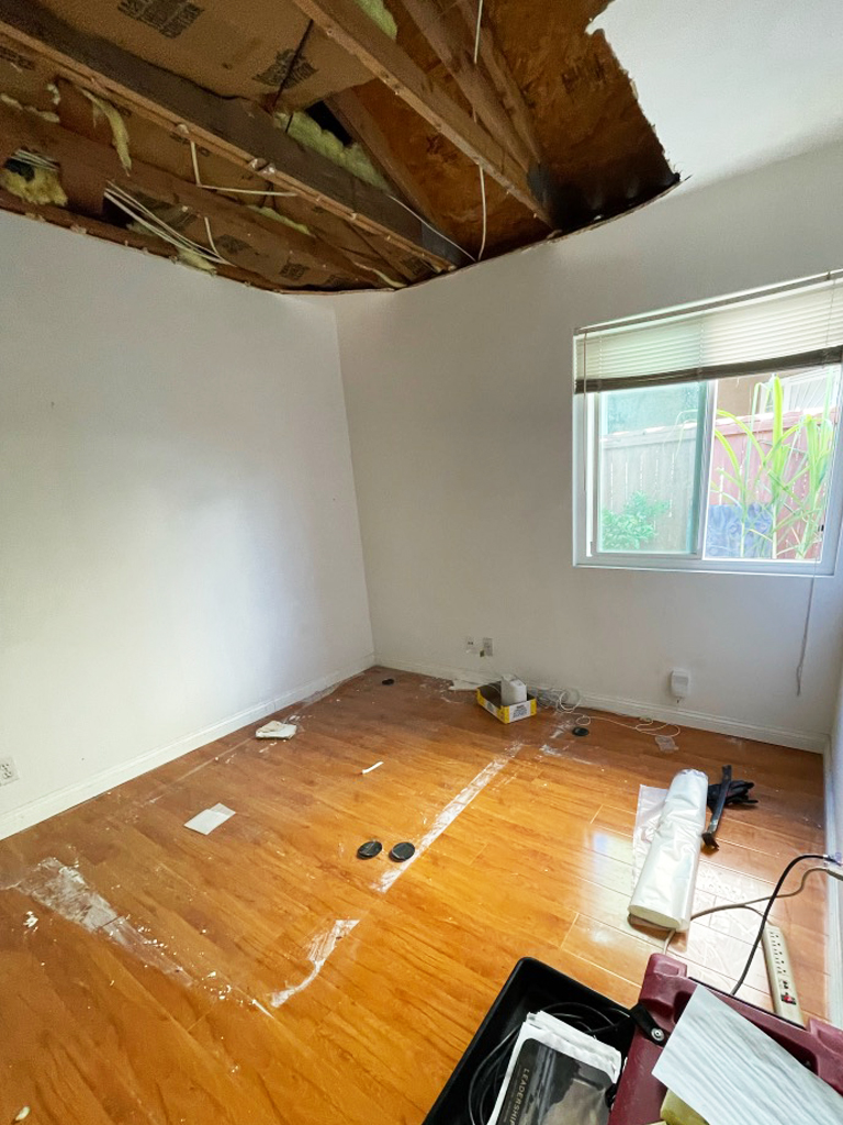 With the drying phase showing positive results, we proceeded with the demolition of unsalvageable materials. Remaining ceiling drywall, compromised insulation, and damaged laminate flooring were methodically removed. To ensure the safety of our technicians and maintain air quality, a HEPA air scrubber was operated throughout the demolition.