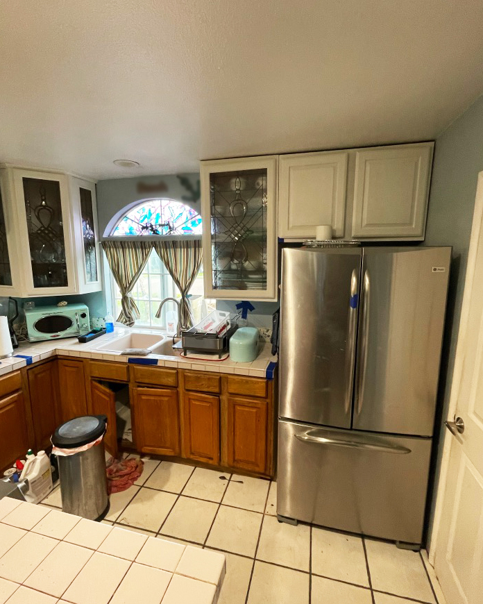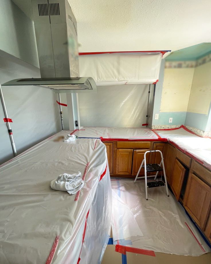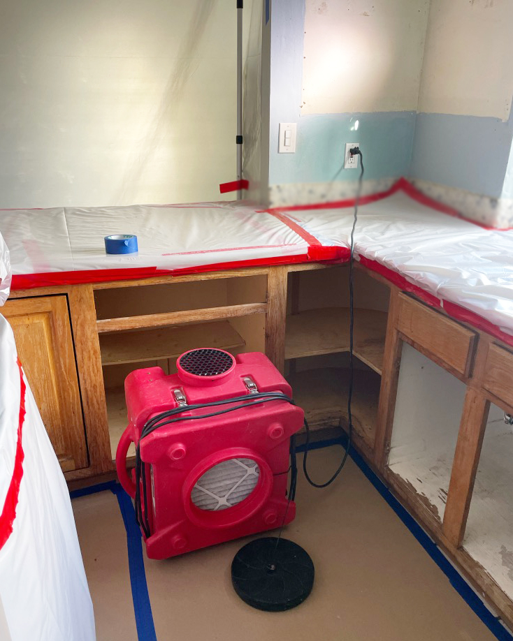 Industrial-grade dehumidifiers and a HEPA air scrubber were strategically placed throughout the affected areas to pull moisture from the kitchen and maintain a safe environment. Equipment ran continuously over three days, with daily monitoring to track progress. During this time, the team moved out all contents—including appliances—and created a plastic containment chamber to isolate the damaged area and minimize cross-contamination. Unaffected upper cabinets were carefully detached to allow full access to the drywall and ceiling for proper drying.