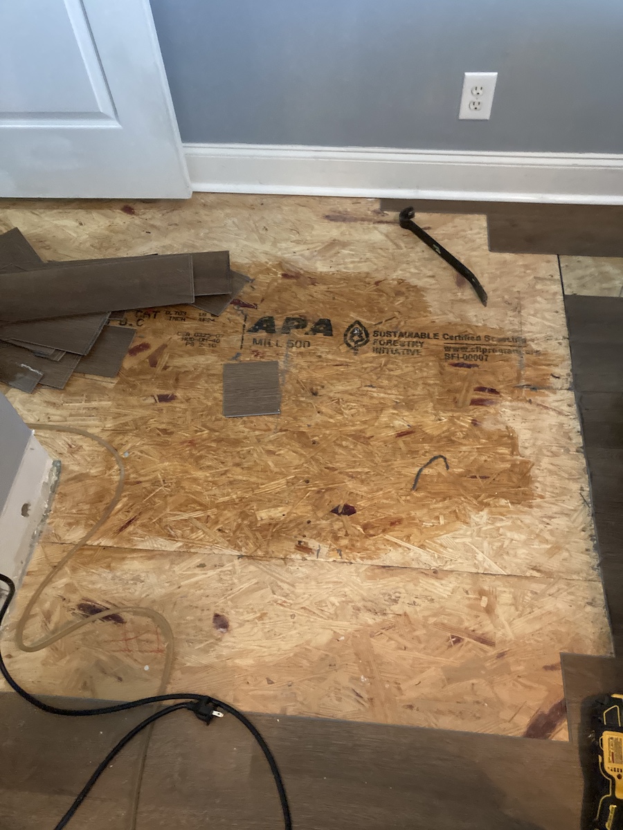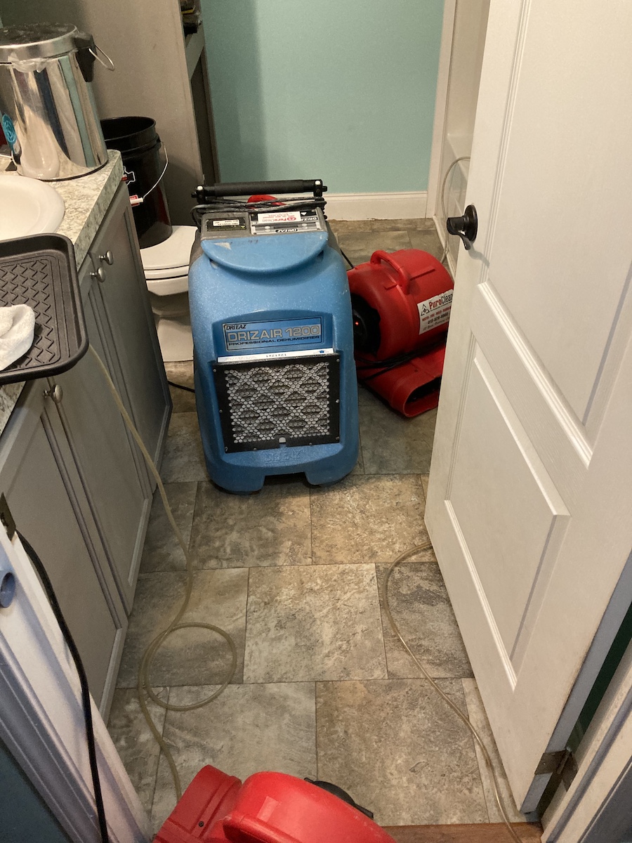 Our skilled technicians removed the baseboards and drilled holes in the wall so they would be able to dry out the wood framing. They also removed the vinyl plank flooring to dry out the plywood subfloor.